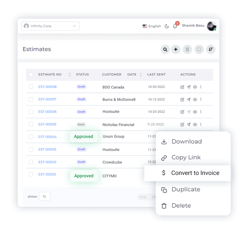 - Quick Conversion to Invoice: Once your estimate is approved, transition seamlessly. With a single click, convert the accepted estimate into a detailed invoice, capturing all client preferences and modifications.