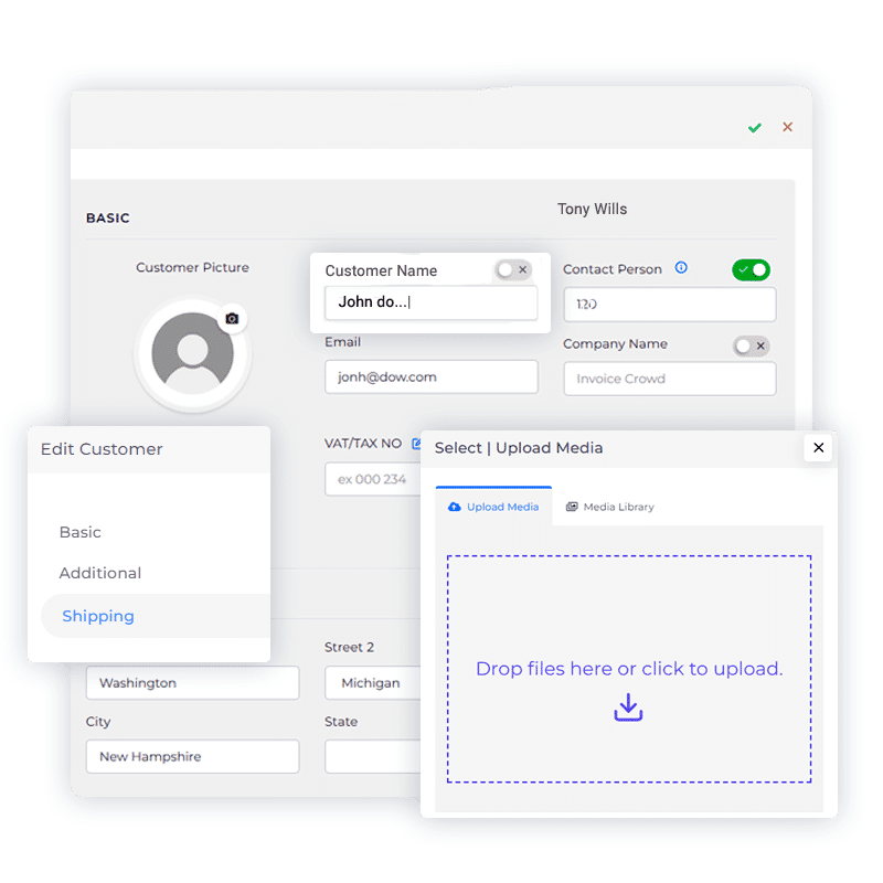Overview Your business thrives on connections, and at Invoice Crowd, we understand the value of each relationship. Our dedicated “Manage Contacts” section ensures that you have a 360-degree view of each customer, from their contact details to every transaction they’ve made with you.
