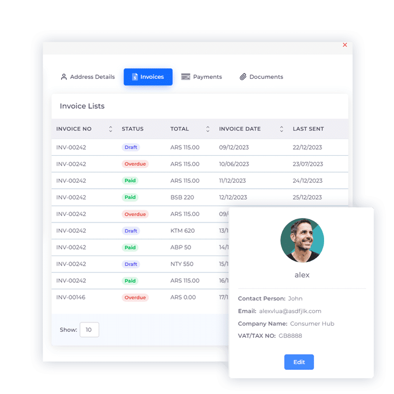 Dive deep into each customer’s transactional history. See every invoice sent, paid, and pending, ensuring you’re always informed.