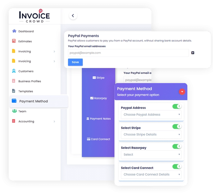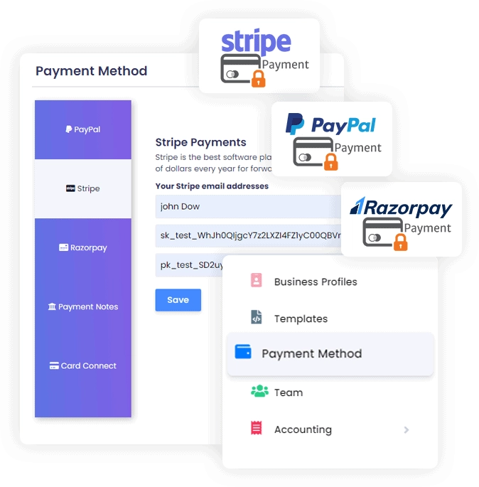 Prove your clients to pay faster by using Paypal, Stripe, Razorpay, and Card Connect.