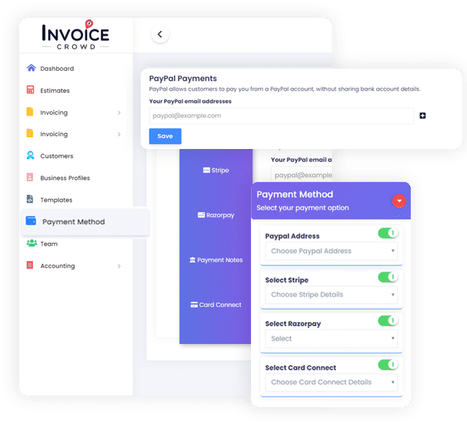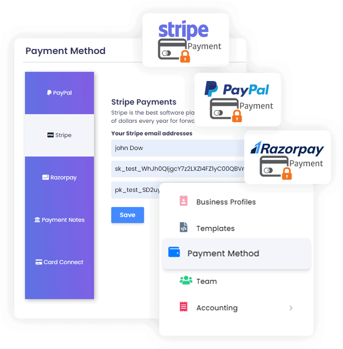 Prove your clients to pay faster by using Paypal, Stripe, Razorpay, and Card Connect.